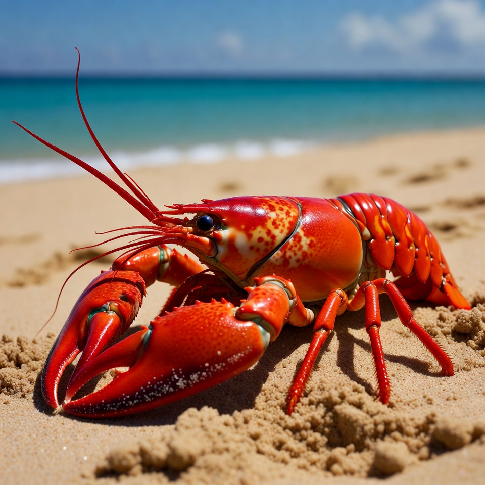 A vibrant red lobster with detailed claws and antennae crawls on golden beach sand near the ocean. Turquoise waves and a clear blue sky with clouds form the background. The lobster's glossy shell features colorful accents.