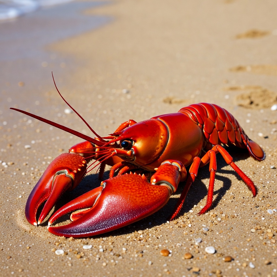 A vibrant red lobster with detailed shiny shell and long antennae crawls across golden beach sand. Ocean waves crash gently in the blurred background. Its large claws and segmented body are prominently featured.