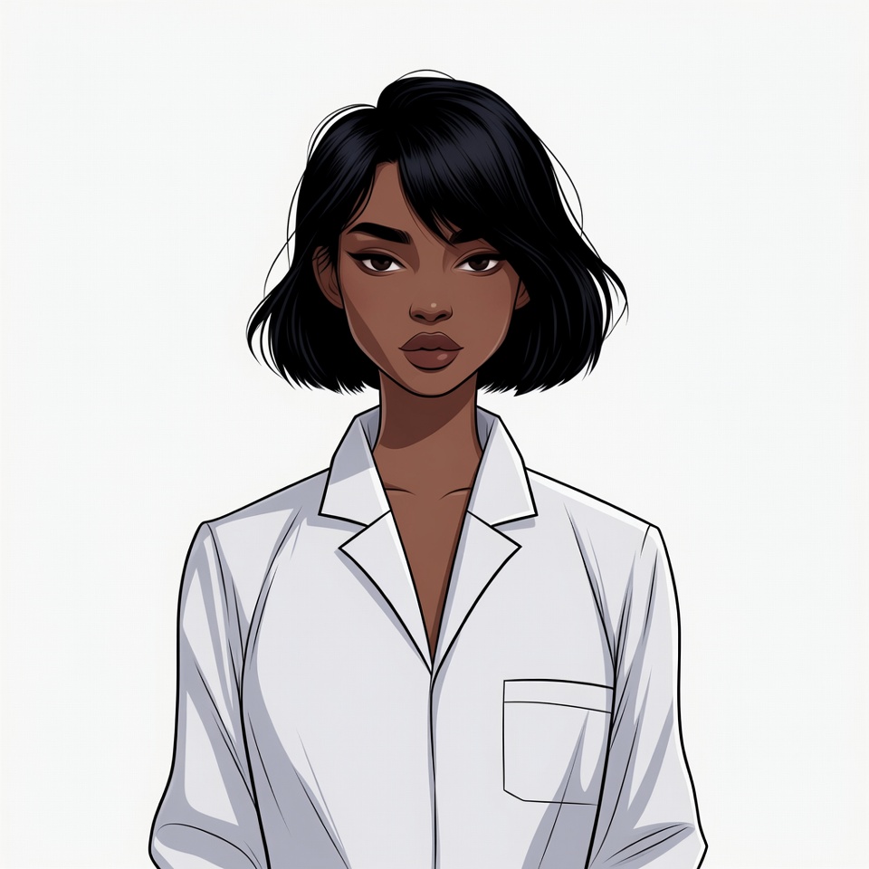 A young African-American woman with short black hair and brown skin wears a white open lab coat. She has a direct gaze with subtle makeup and stands against a plain white background. The illustration style features clean lines and vibrant shading.