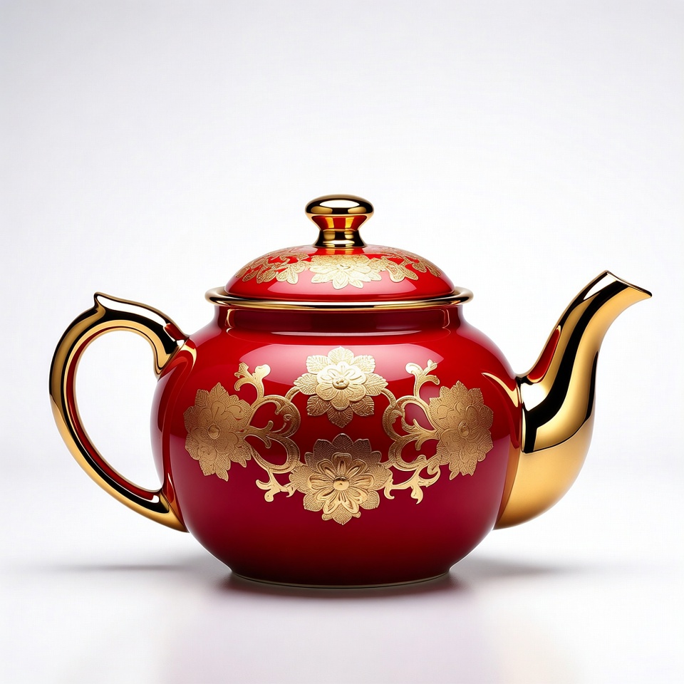 chinese style, decorative teapot, elegant teapot, floral design, gold flowers, gold teapot, gold trim, isolated background, kitchenware, luxury teapot, porcelain teapot, red porcelain, red teapot, teaware, teapot