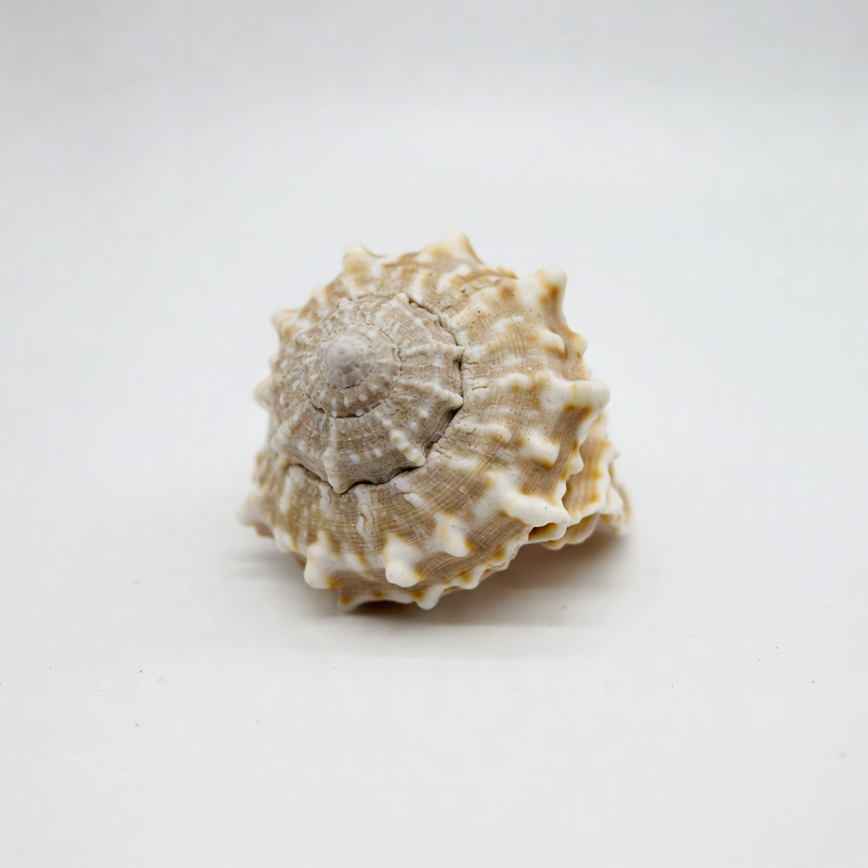 A detailed beige seashell with spiny protrusions and textured ridges sits centered on a plain white background. The shell features a spiral apex and layered, bumpy surface in light tan tones. It is photographed from above, highlighting its intricate natural patterns.
