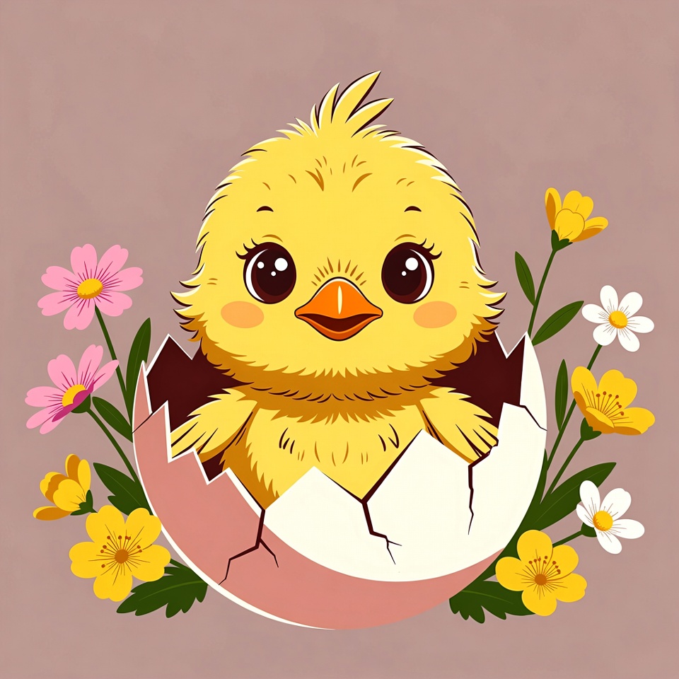 An adorable yellow chick with big eyes peeks out from a cracked pink eggshell. It is surrounded by colorful flowers including pink, white, and yellow blooms on a light beige background. The illustration features a fluffy chick with a small orange beak and tufted feathers.