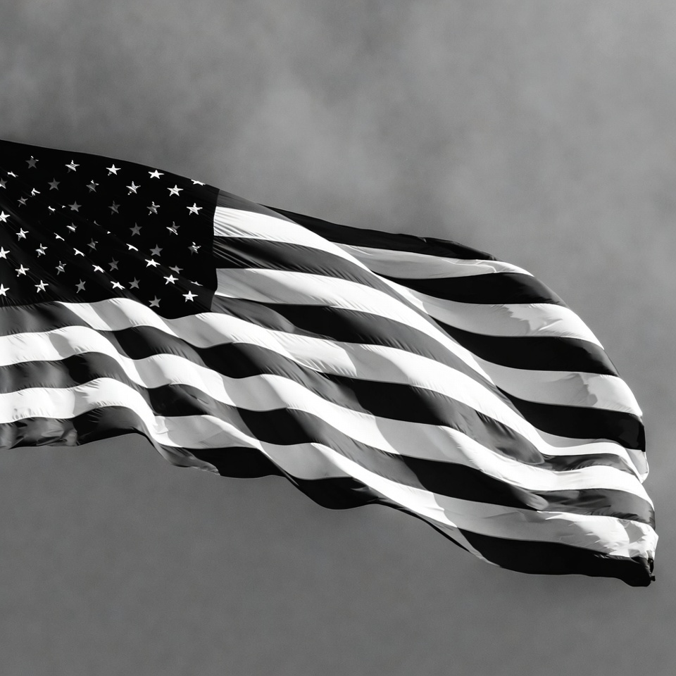 A black and white photograph captures the American flag waving dynamically against a cloudy sky. The flag's stars and stripes are sharply defined with bold contrasts. It billows gracefully in the wind.
