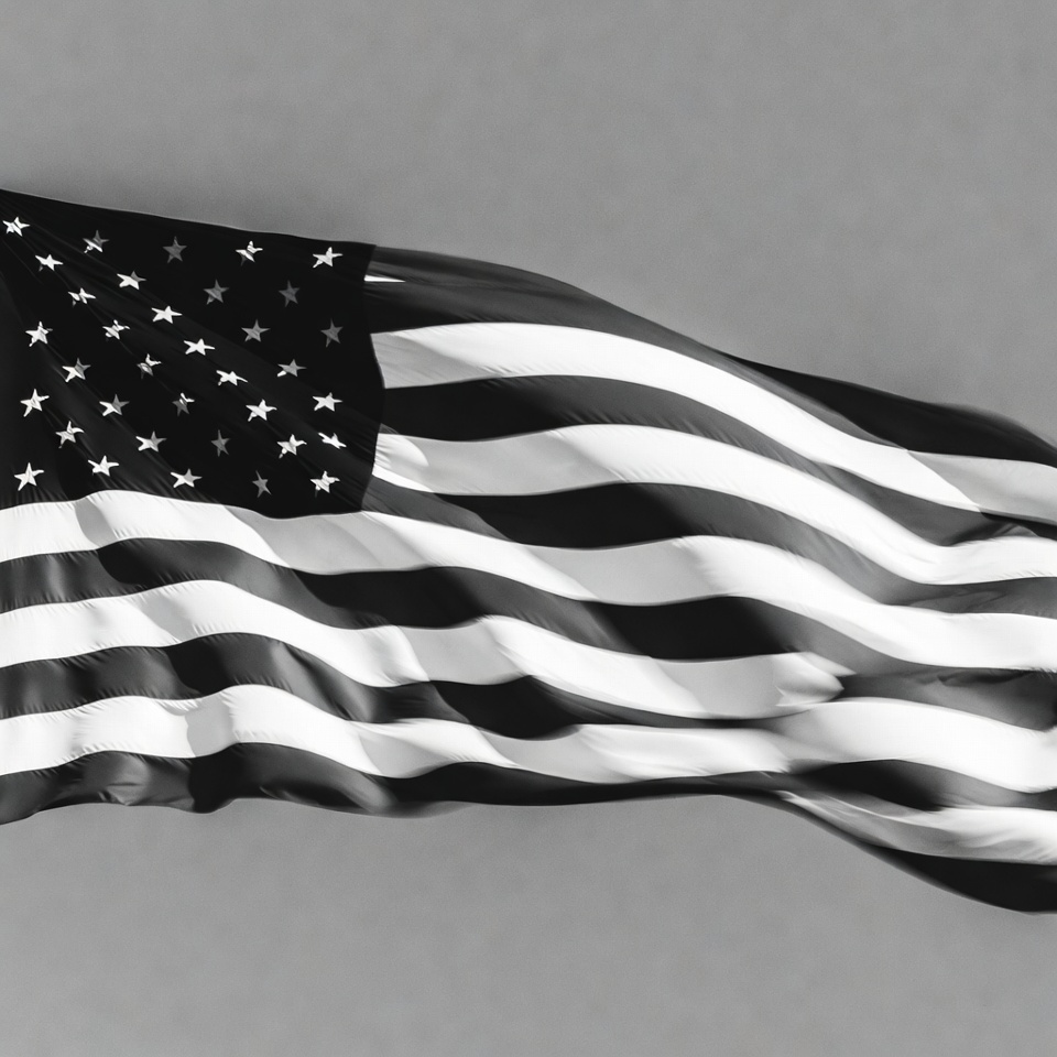 A black and white American flag waves dynamically against a gray background. The flag features thirteen red and white stripes and a blue field with fifty white stars in the upper left corner. The fabric appears to billow in the wind, creating folds and motion.
