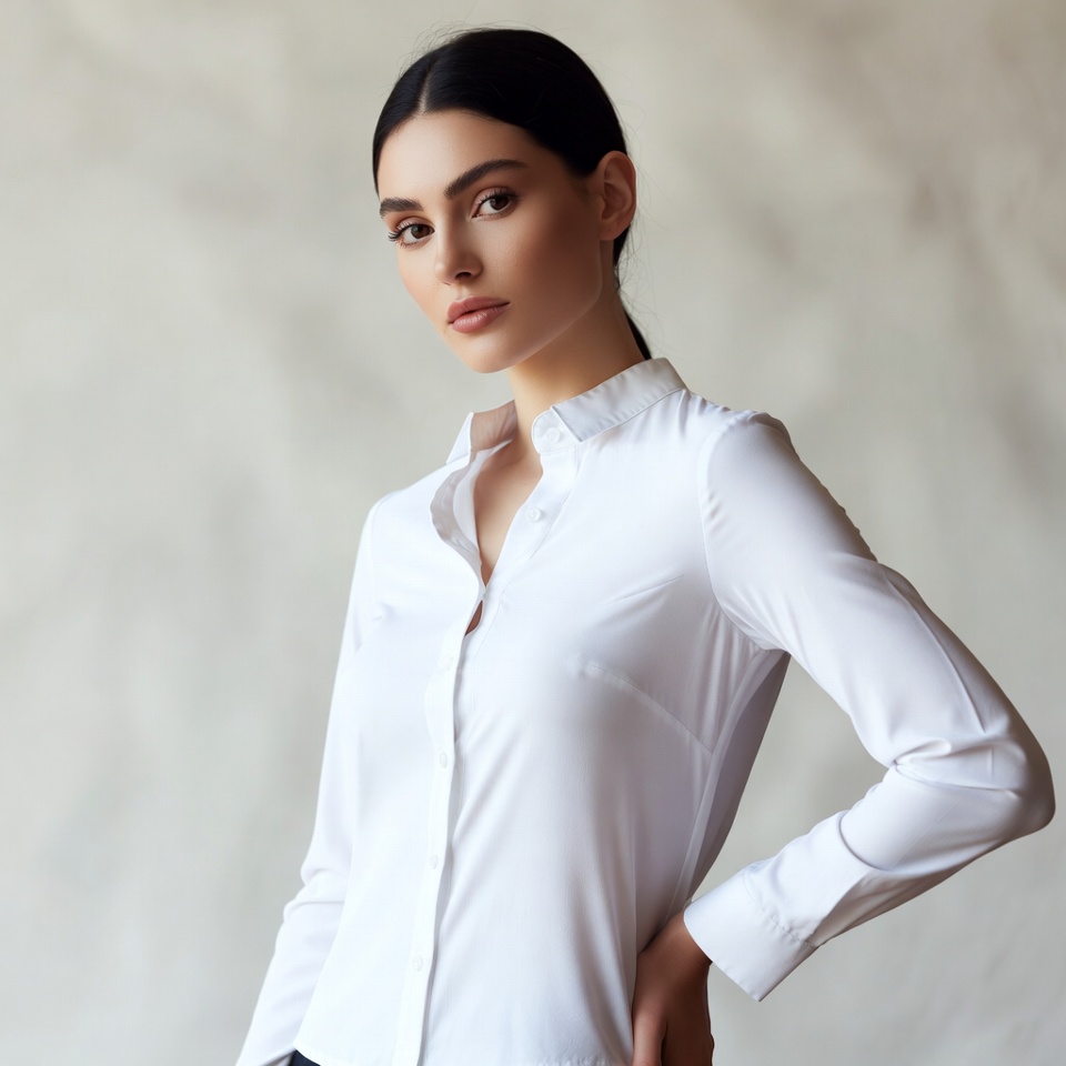 A young woman with long dark hair pulled back stands confidently against a light gray background. She wears a white collared long-sleeve shirt with the top buttons undone and has one hand on her hip. Her expression is poised with direct eye contact.