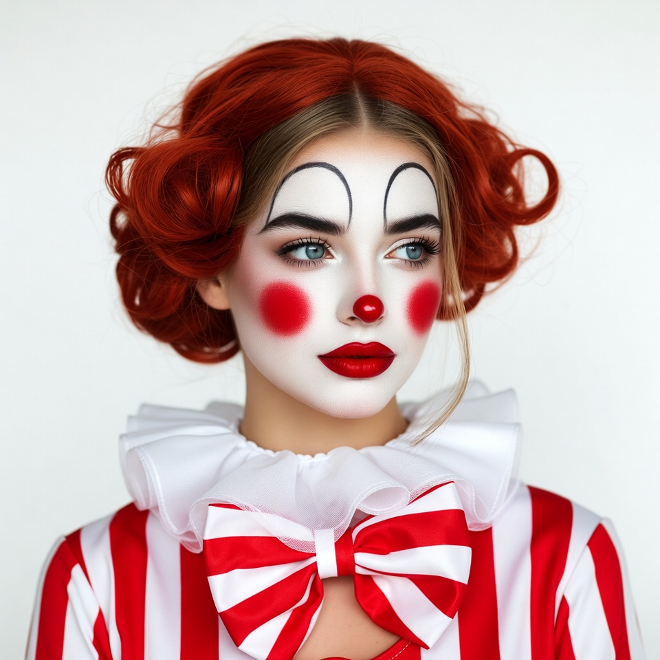 blue eyeshadow, circus, costume, curly hair, face paint, female, makeup, portrait, red bow, red hair, red lips, red nose, red wig, ruffled collar, striped costume, white background, white makeup, woman, young woman, clown