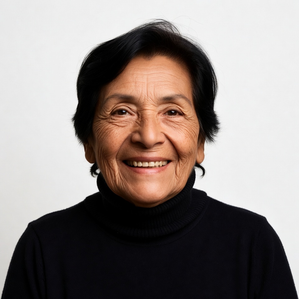 Asian, Asian woman, black turtleneck, female, happy face, headshot, mature woman, portrait, senior woman, short black hair, smiling woman, turtleneck sweater, white background, wrinkles, elderly woman