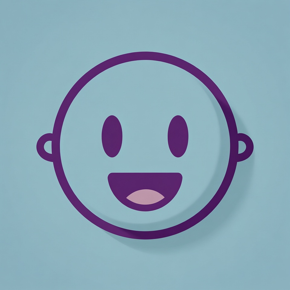 A simple purple-outlined cartoon face with light blue skin smiles widely on a solid blue background. It features large round purple eyes and a big open mouth revealing a pink tongue. The illustration has a cheerful, minimalist design with thick outlines.
