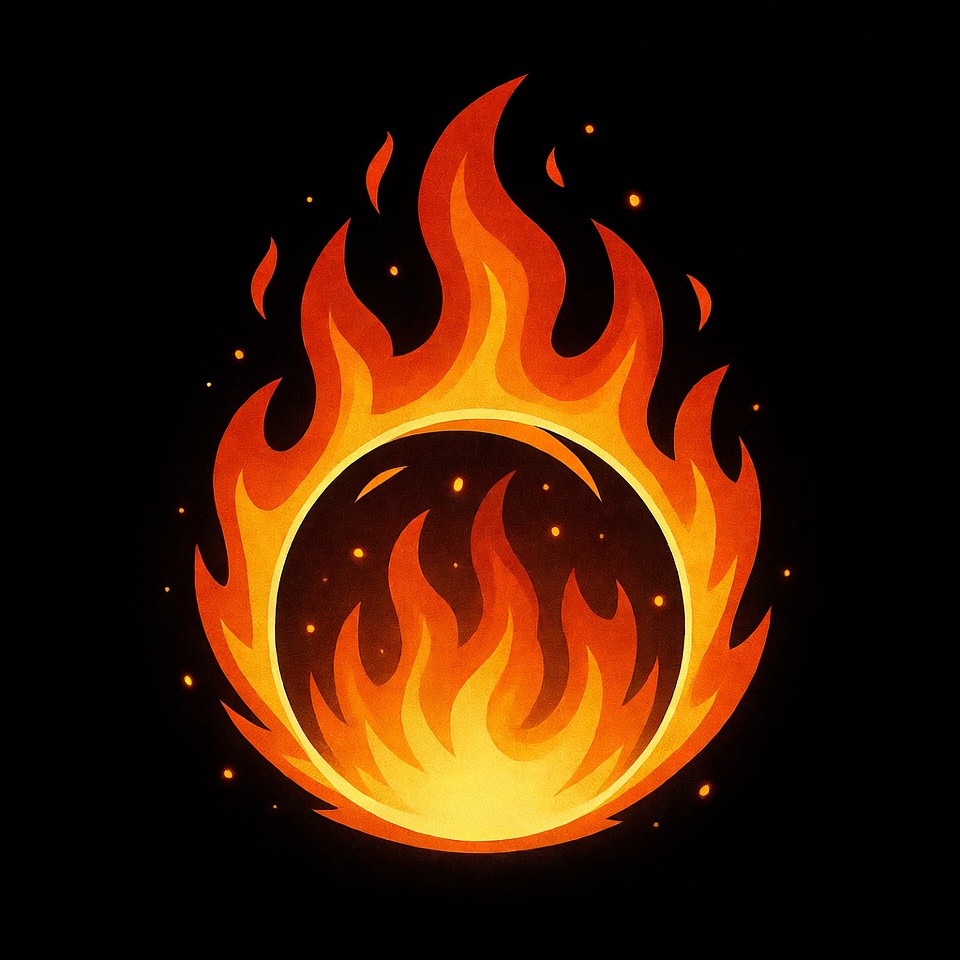 A vibrant illustration of a circular ring made of intense orange and yellow flames glows against a solid black background. The flames curve dynamically to form a perfect circle with sparkling embers inside the dark center. The design features bold, stylized fiery effects with smooth gradients.