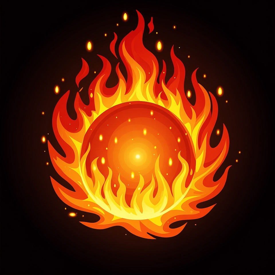 A vibrant illustration of a glowing orange ball engulfed in bright red and yellow flames. Flames flicker dynamically around the spherical core on a solid black background. The design features a cartoonish, isolated style with sparkling fire effects.