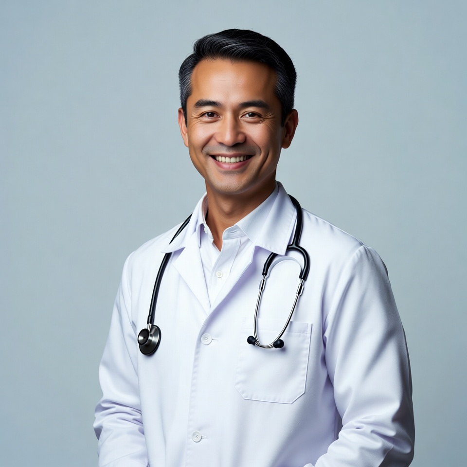 A smiling Asian man wearing a white doctor's coat and stethoscope stands against a light blue background. He has short dark hair, a collared shirt underneath, and a friendly expression. The stethoscope hangs around his neck.