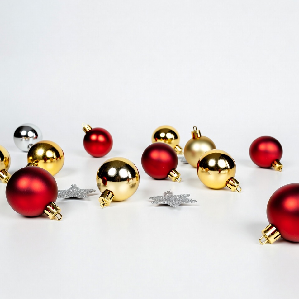 Various red, gold, and silver Christmas baubles are scattered on a white background. Shiny metallic ornaments in multiple sizes lie haphazardly across the surface. Two silver stars are placed among the festive balls.