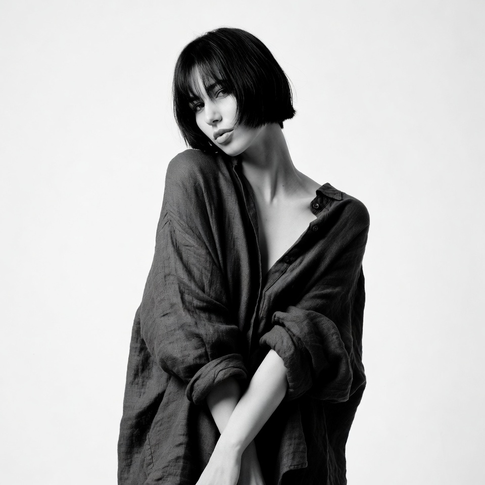 bare chest, black and white, bob haircut, fashion pose, female, linen shirt, monochrome, open shirt, oversized shirt, portrait, pursed lips, short black hair, side pose, studio photo, subtle expression, white background, woman