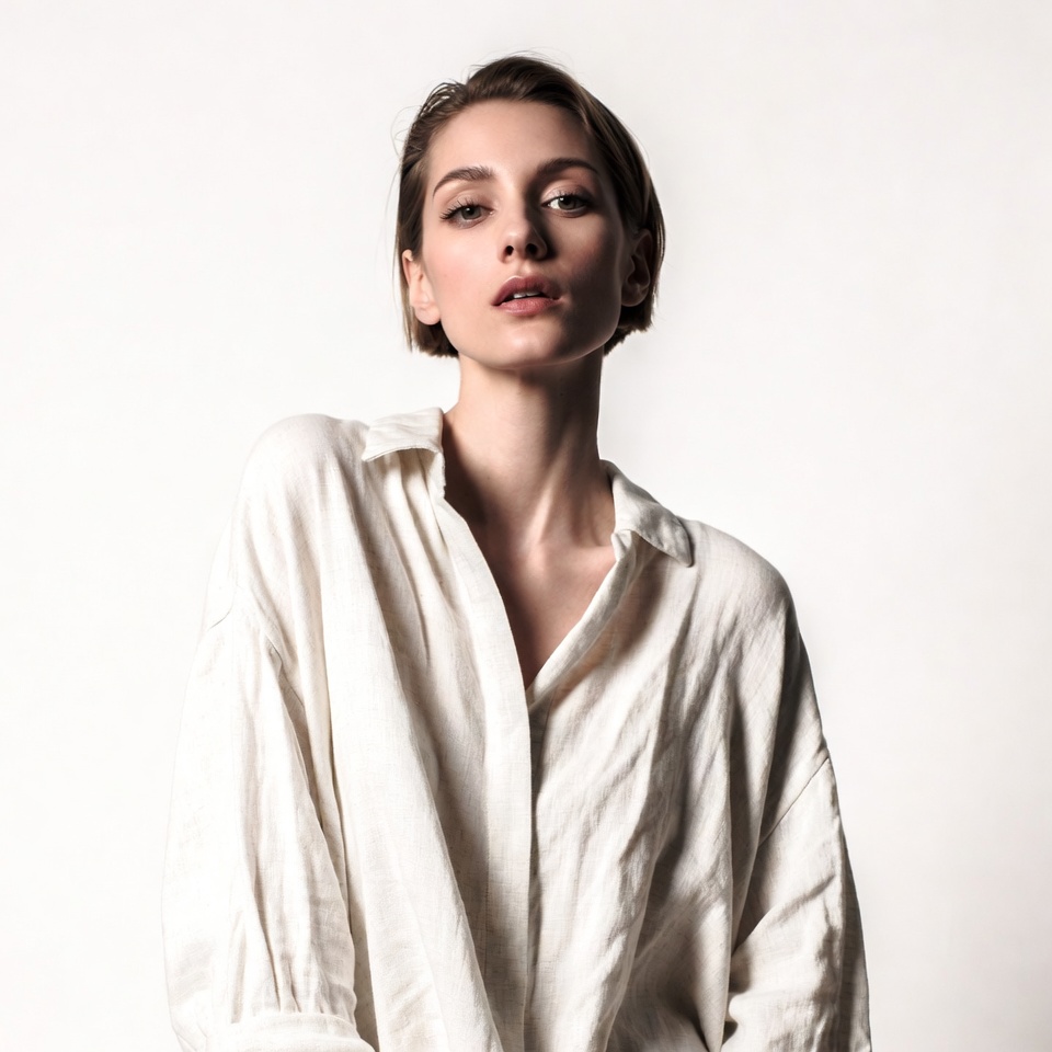 A young woman with short brown hair and fair skin poses confidently against a plain white background. She wears an oversized white linen shirt with a deep V-neck, slightly unbuttoned at the collar. Her expression is direct with subtle lips parted.