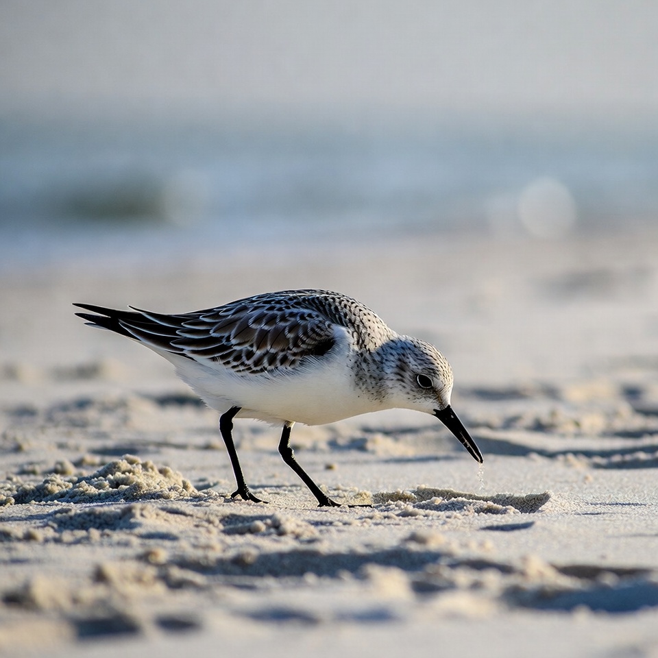 A small sanderling with gray and white plumage walks on a sandy beach. It probes the sand with its thin black bill while standing on thin black legs. The background shows a blurred ocean and sky.
