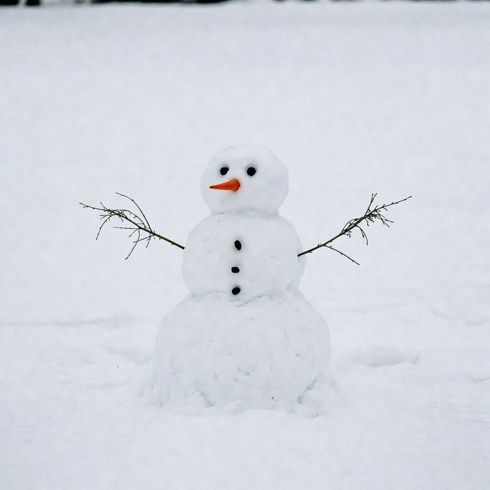 A classic snowman stands in a snowy field with three stacked snowballs forming its body. It has a bright orange carrot nose, black coal eyes and buttons, and twig arms outstretched. The snowman is centered against a vast white snowy background.