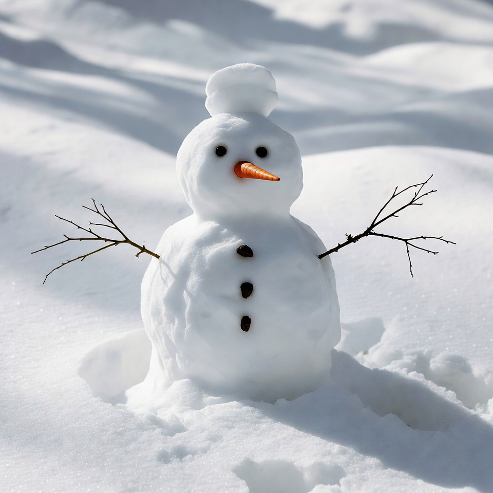 A classic snowman stands in a snowy field with a white hat on top, black coal eyes and buttons, and a bright orange carrot nose. It has twig arms outstretched and is partially sunk into the snow. Sunlight casts shadows on the surrounding snowdrifts.
