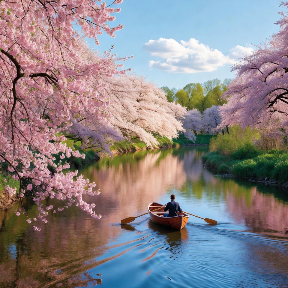 A man sits in a wooden rowboat paddling down a calm river surrounded by blooming pink cherry blossom trees. The water reflects the vibrant sakura branches and green foliage along the banks. A clear blue sky with scattered clouds adds to the serene spring landscape.
