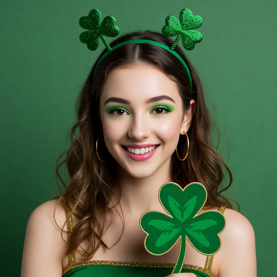 A young woman with wavy brown hair and green eyes smiles at the camera while wearing a green shamrock headband. She holds a large green shamrock leaf in her hand and wears a green top. The image features a solid green background.