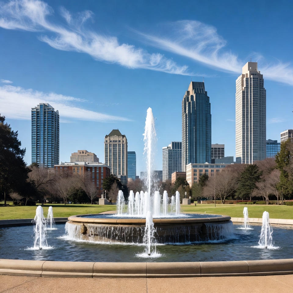 architecture, bare trees, blue sky, buildings, circular fountain, cityscape, clouds, grass, green lawn, jets, outdoor, park, skyline, skyscrapers, tall buildings, trees, urban park, water fountain, water spray, fountain