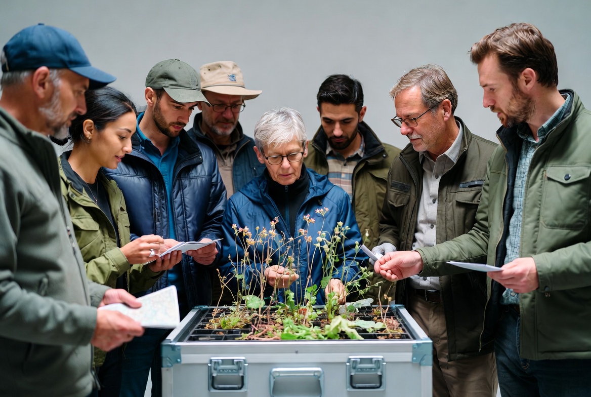 A diverse group of men and women in casual jackets and hats gathers around a metal tray containing small plants and soil. They hold notebooks and point at the plants, closely inspecting them together. The setting appears to be indoors against a plain background.