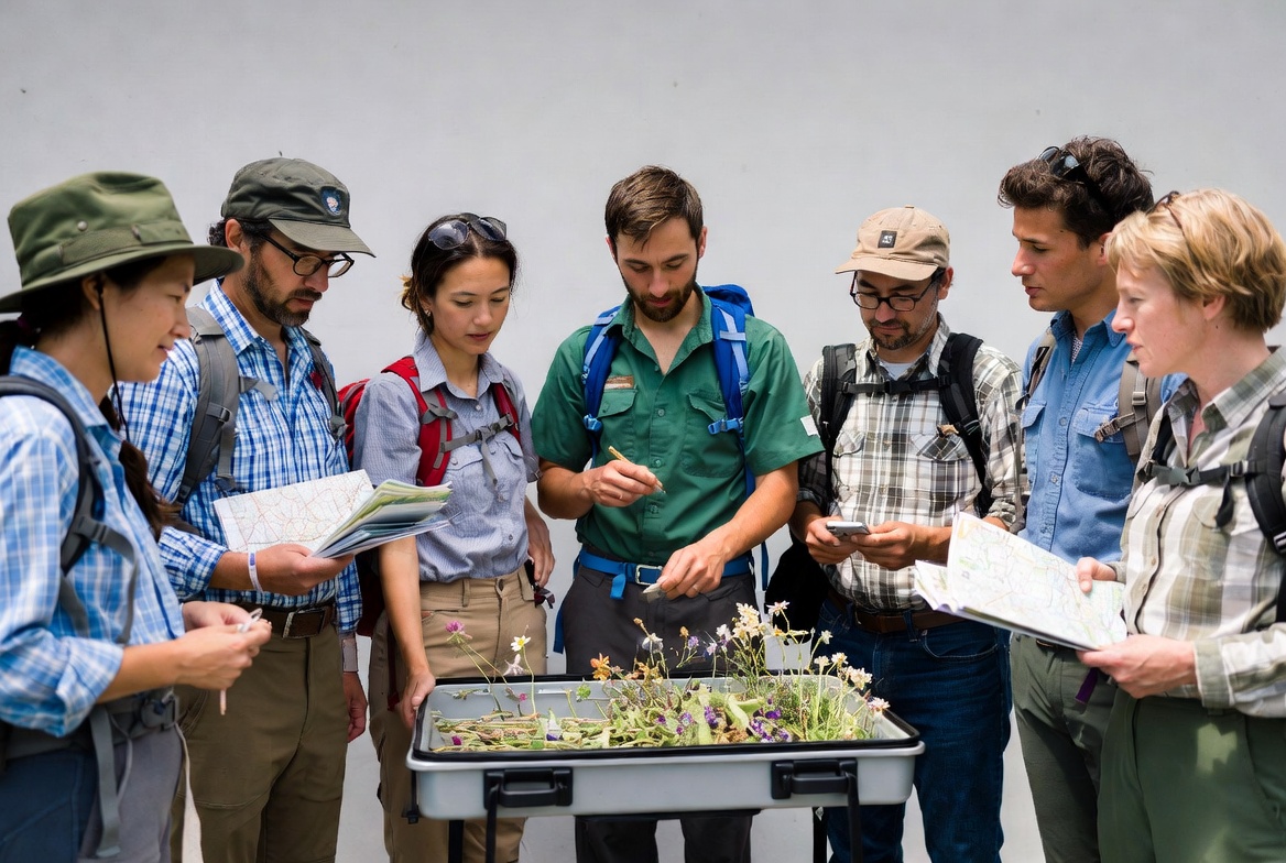 A diverse group of men and women in field uniforms and hats gathers around a table holding a tray of green plants and wildflowers. They examine maps, notebooks, and tablets while pointing at the specimens. The setting features a plain background with everyone focused on the plants.