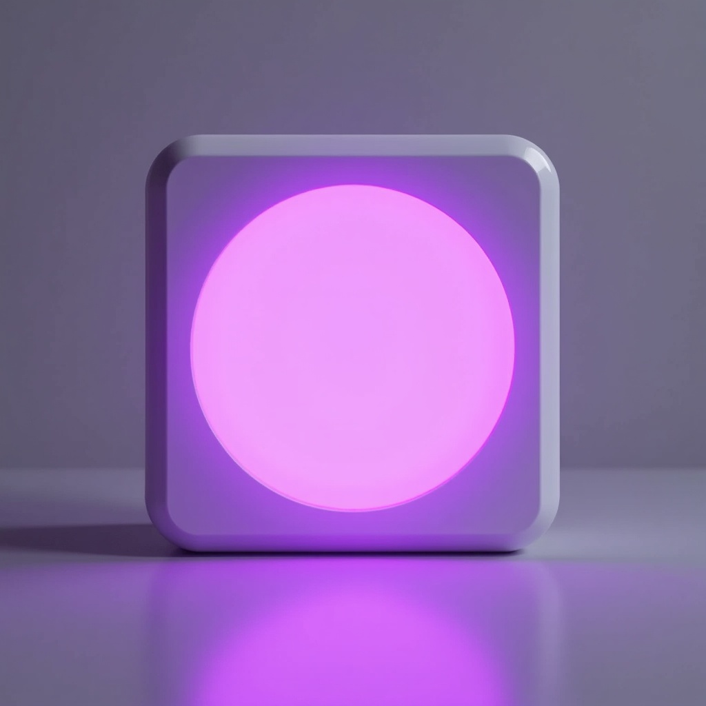 LED light, ambient light, bedside lamp, circular light, glowing light, isolated background, modern design, nightlight, purple glow, purple light, soft glow, square light, white device, white square, night light