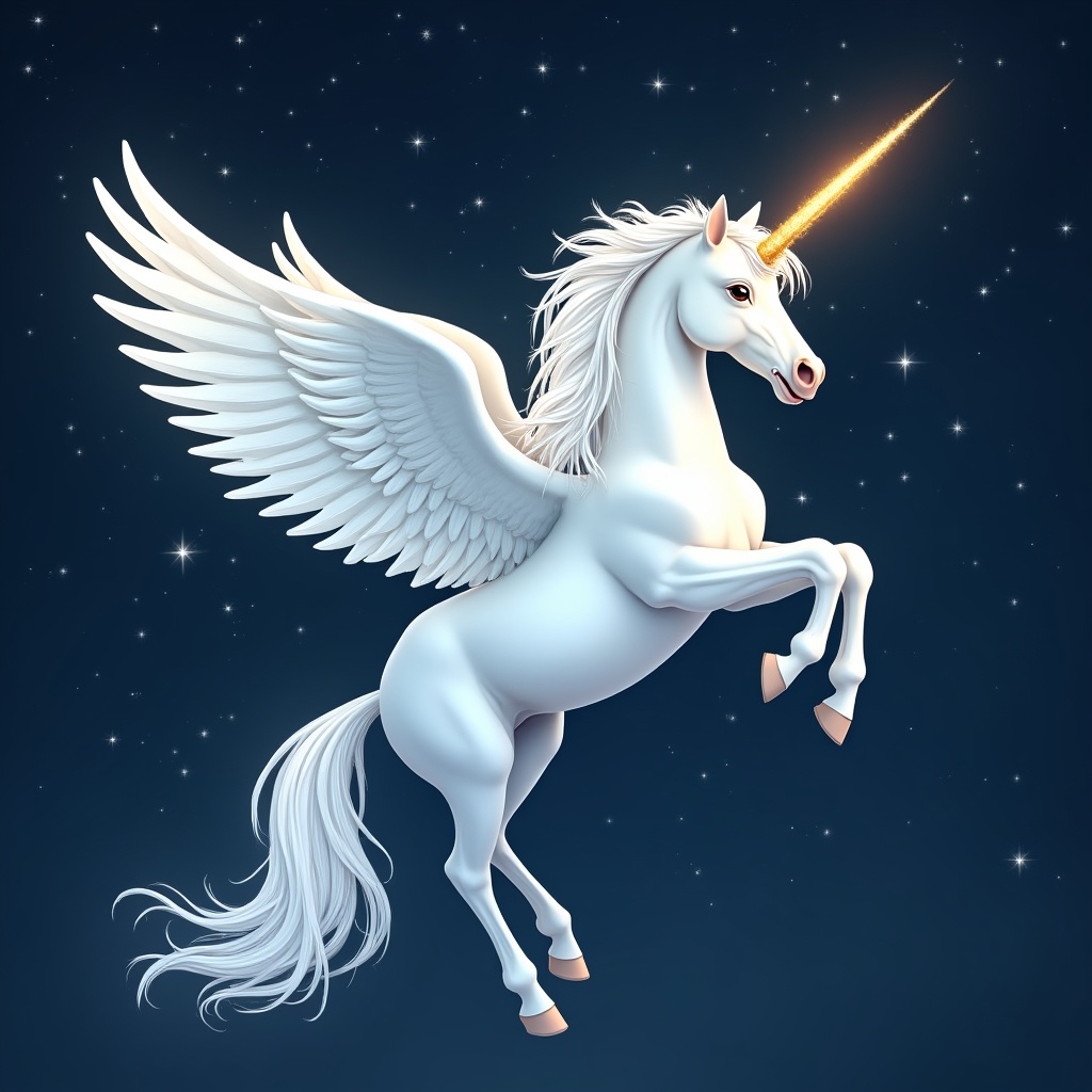A majestic white winged unicorn with a glowing golden horn rears up on its hind legs. It has flowing white mane and tail, large white wings, and stands against a dark starry night sky. The illustration features smooth, glossy shading and an isolated background.