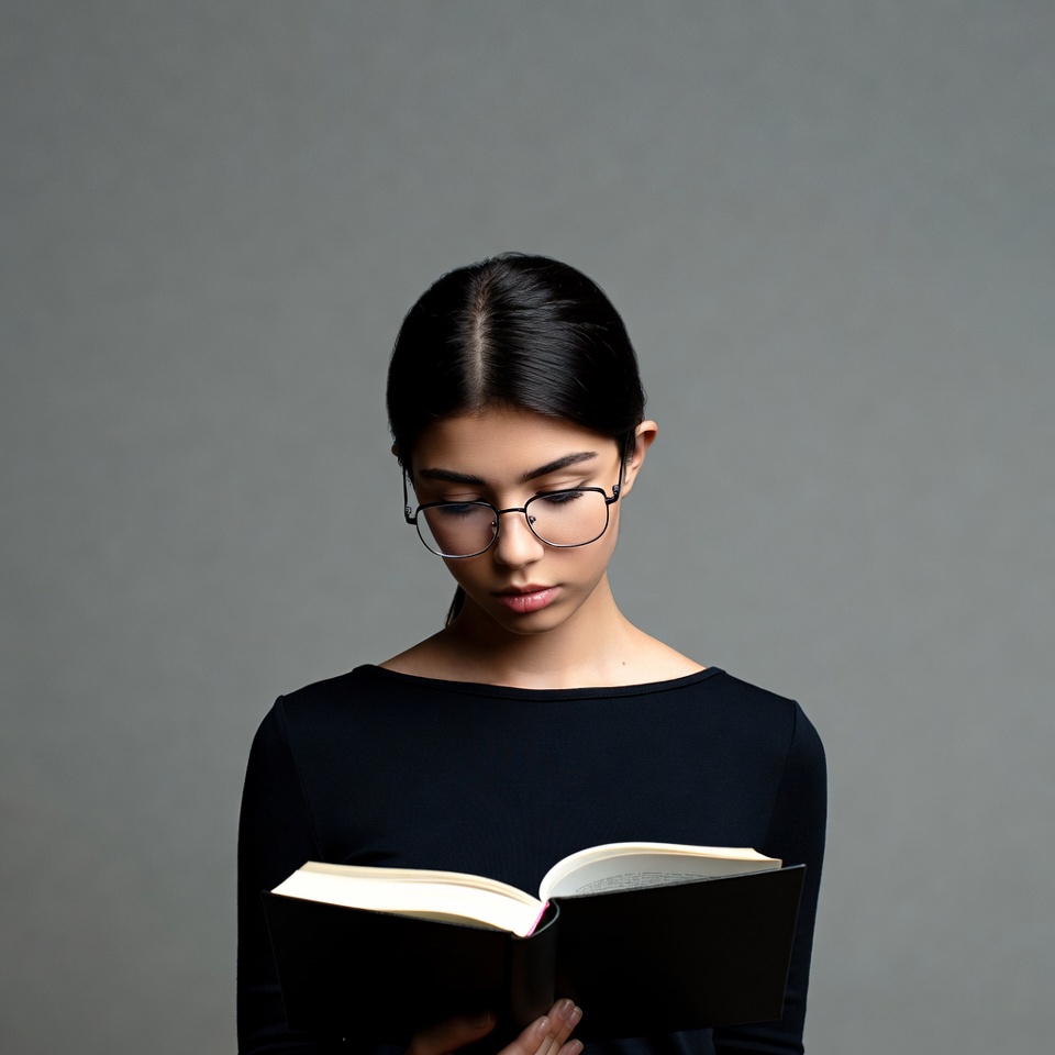 A young Asian woman with straight black hair pulled back wears black-framed glasses and a black top. She holds an open book in both hands, intently reading while standing against a plain gray background. Her expression is focused and serene.