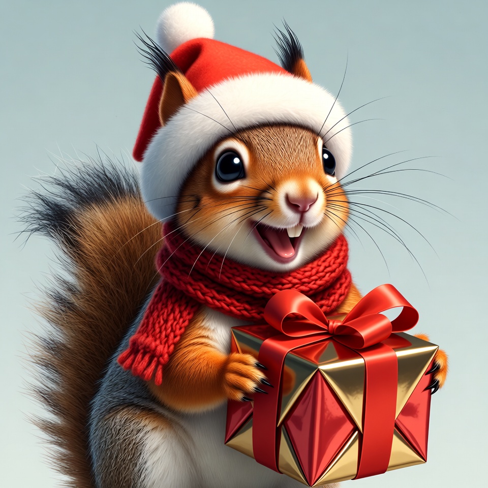 3D render, Christmas animal, Christmas squirrel, Santa hat, animal illustration, big eyes, brown squirrel, cute animal, festive squirrel, fluffy tail, gift box, gold box, happy squirrel, holding gift, holiday gift, isolated background, red bow, red scarf, smiling squirrel, squirrel with present, winter animal, squirrel