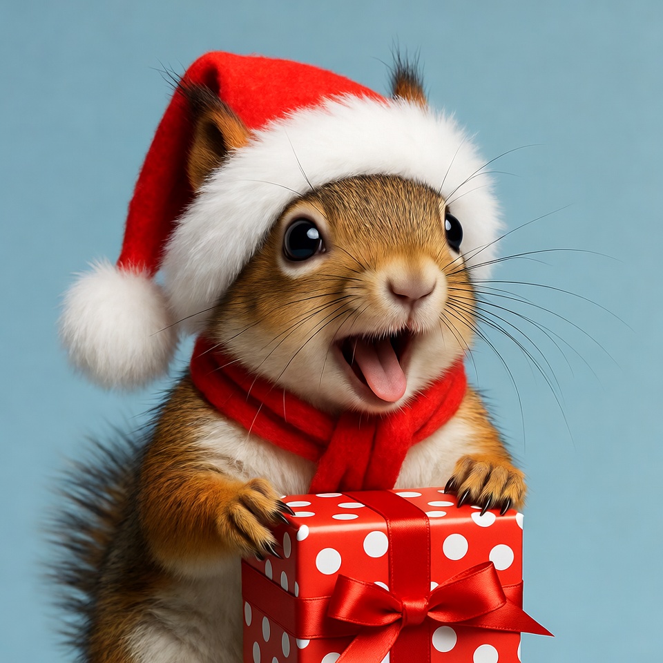Christmas, Santa hat, big eyes, blue background, bow, cute animal, festive, fur, gift box, holiday, isolated, paws, polka dot box, red scarf, tongue out, whiskers, white pom pom, squirrel