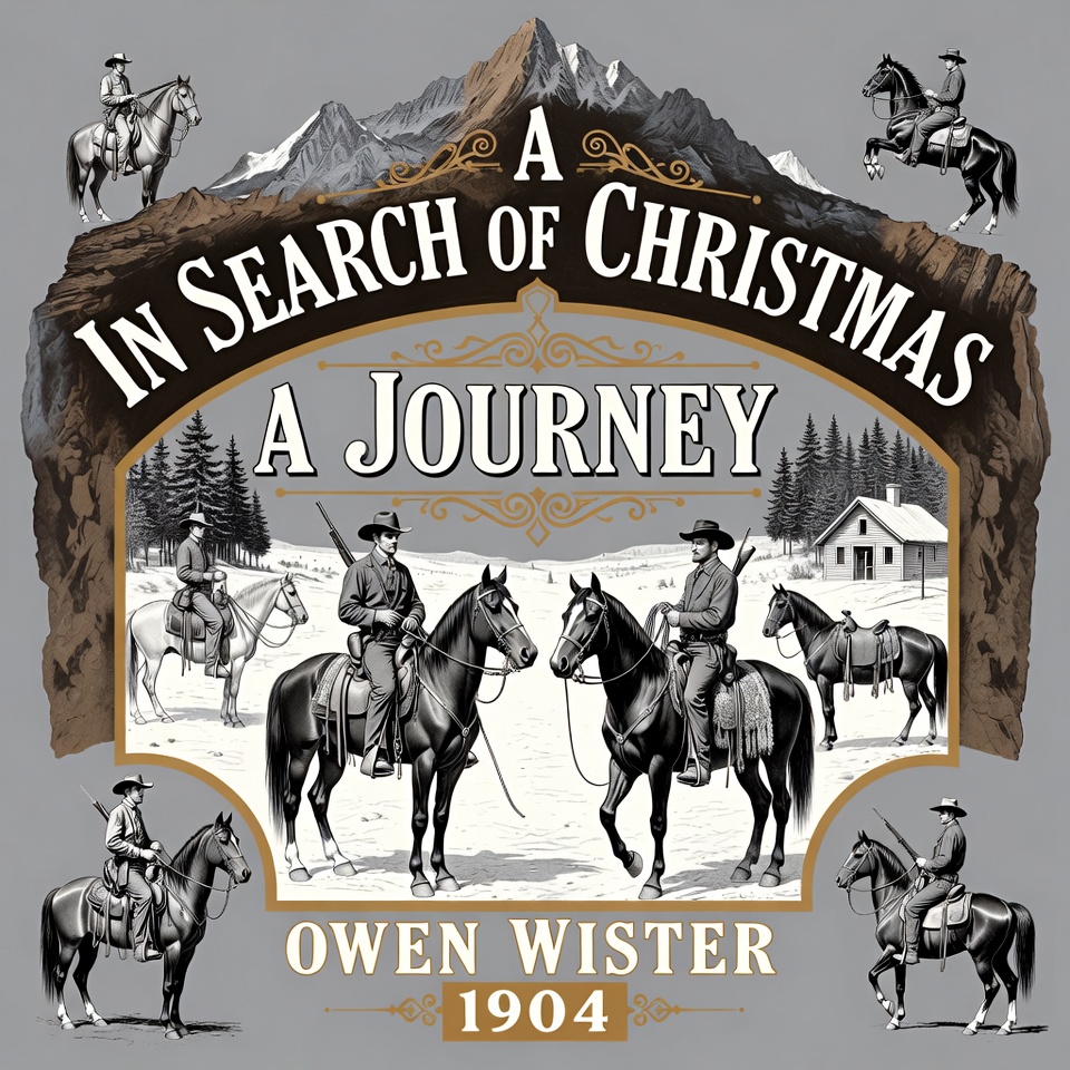 Black and white illustration depicts cowboys on horseback in a snowy mountain landscape with pine trees and a cabin. The ornate title 'In Search of Christmas: A Journey' by Owen Wister 1904 is prominently displayed at the top and bottom. Multiple cowboy figures are positioned around the framed scene on a gray background.