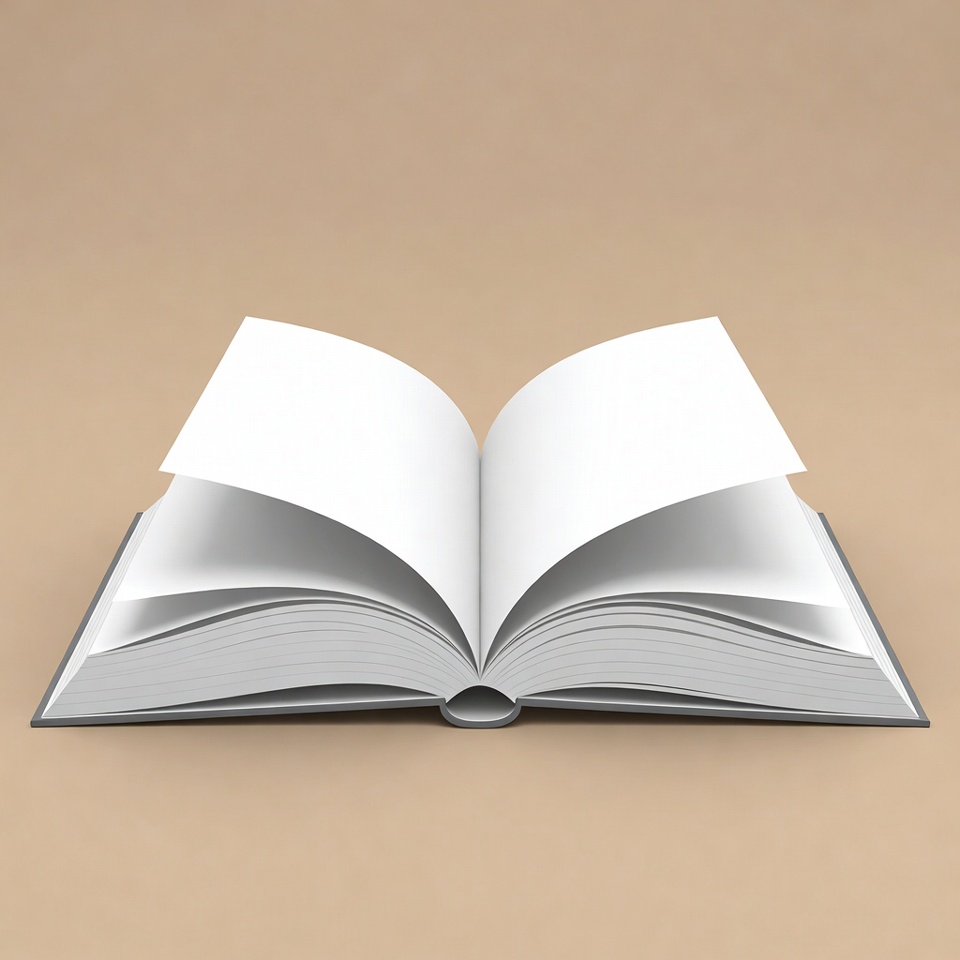 A 3D rendered white book with gray edges lies open on a smooth beige surface. The pages are blank and spread wide, creating a symmetrical view. The book is centered and isolated against the solid background.