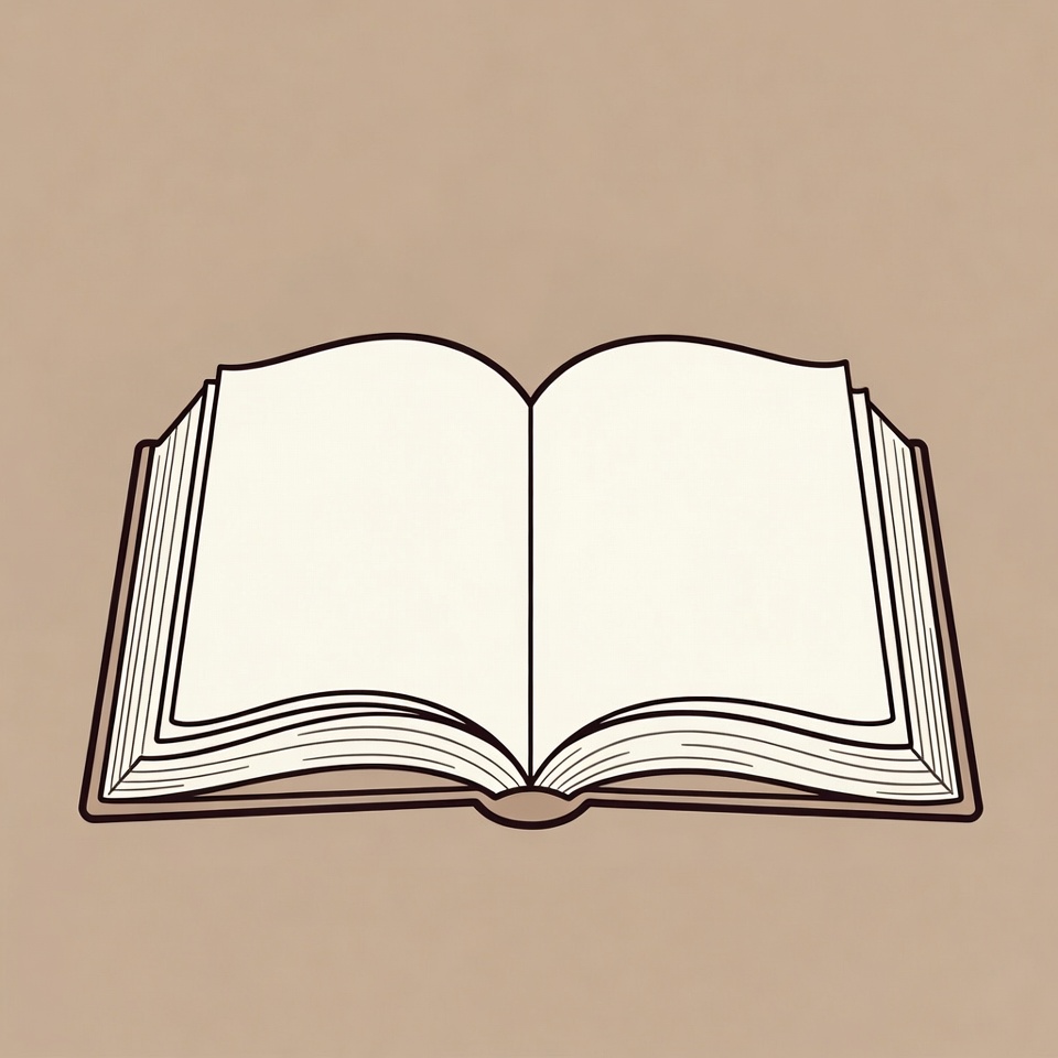 A simple line art illustration of an open book with blank pages. The book features thick outlines and smooth curves on a solid beige background. It is centered and isolated for easy use.