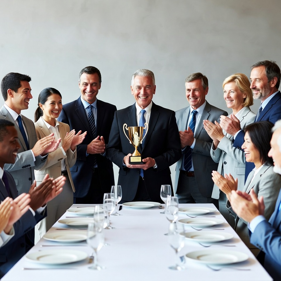 A smiling older man in a suit holds a gold trophy while standing at a long conference table with white plates and wine glasses. Diverse group of men and women in business attire applaud enthusiastically around him. They are gathered in a modern room with a gray wall background.
