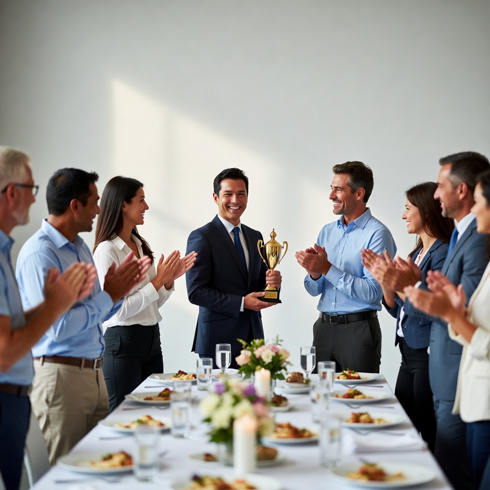 A smiling man in a dark suit holds a gold trophy while surrounded by a diverse group of male and female colleagues clapping in applause. They stand around a long white table set with plates, glasses, flowers, and candles in a modern office with a white wall and natural light. The team members wear business attire including suits, blouses, and slacks.