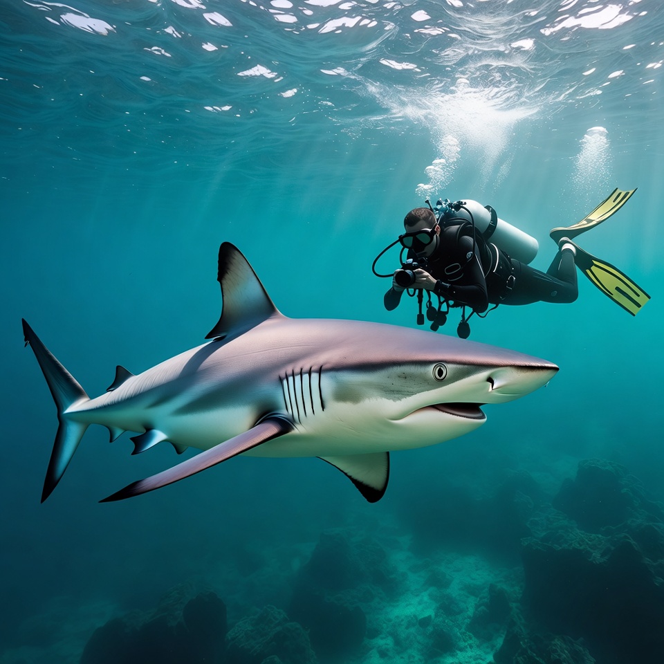 White, blacktip shark, blue water, coral reef, male, marine life, ocean, ocean floor, reef shark, rocks, scuba diver, scuba gear, sea, shark, sunlight, swimming, underwater, wetsuit, yellow fins, diver