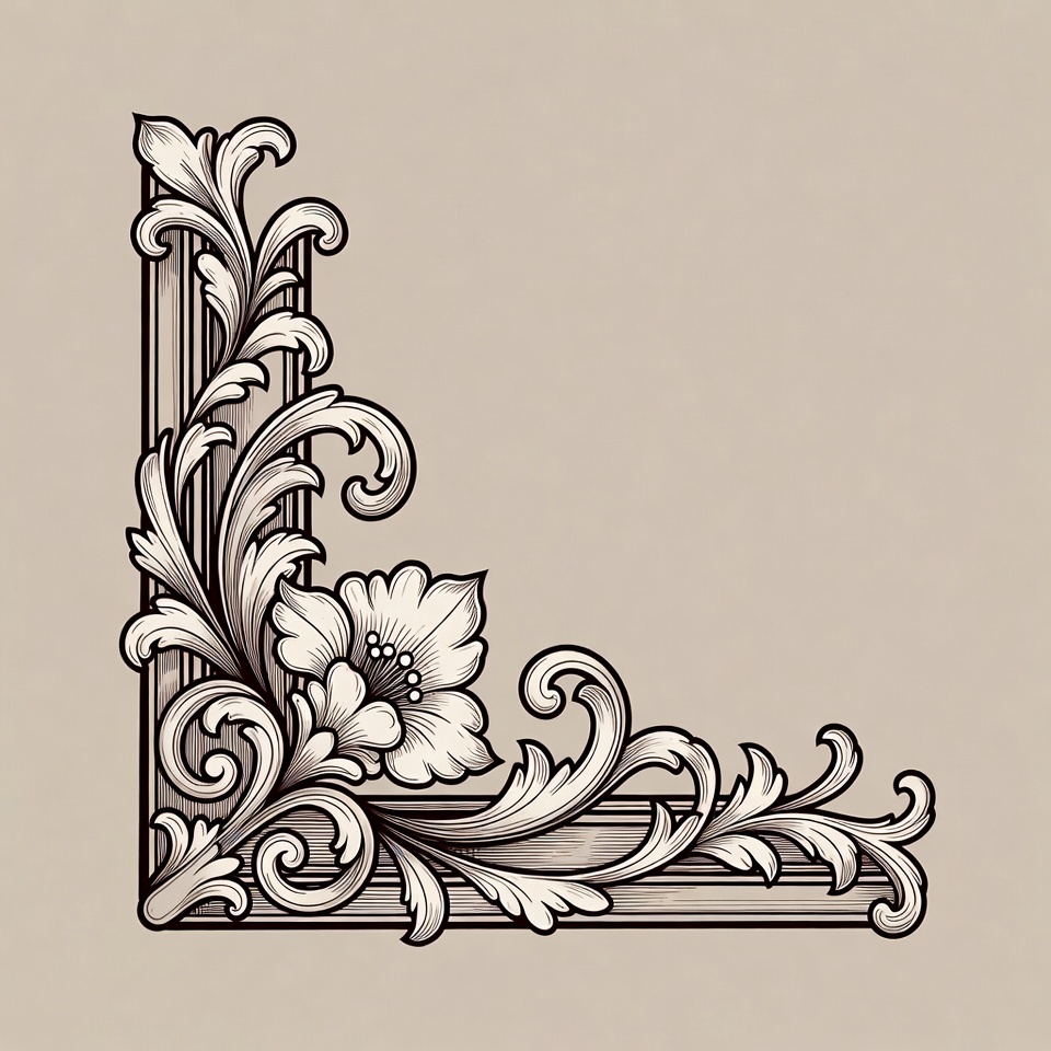 artistic border, beige background, blooming flower, botanical illustration, clipart, corner element, decorative border, elegant design, engraving, floral motif, flower, illustration, leaves, line art, ornament, swirl design, vector art, vines, vintage ornament, floral corner