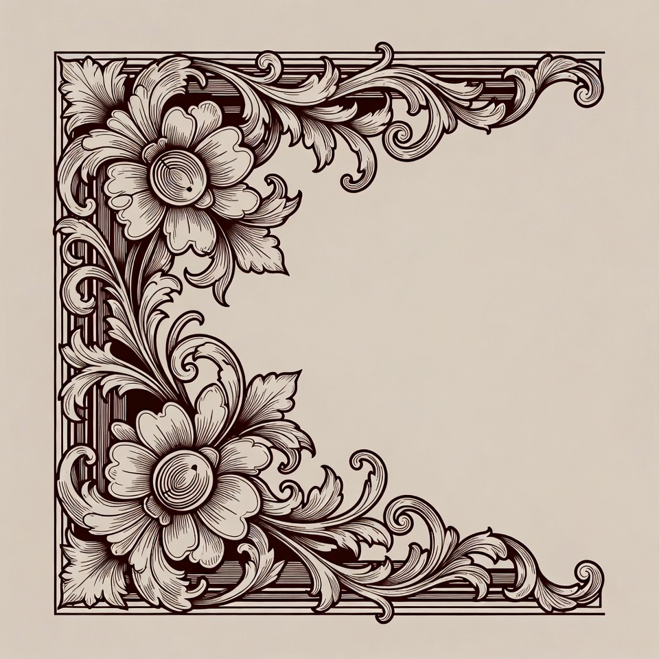 artistic frame, beige background, black ink, corner design, decorative frame, elegant border, engraving style, floral corner, flowers, graphic design, leaves, line art, ornate illustration, petal details, swirl motifs, symmetrical pattern, vector art, vines, vintage ornament, floral border
