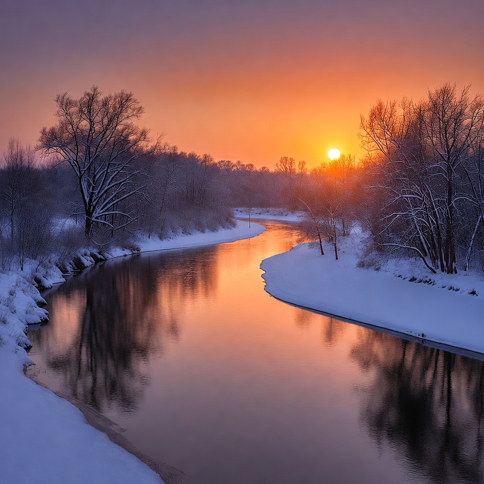 A serene river winds through a snowy landscape under a vibrant sunset sky transitioning from purple to orange. Bare trees covered in snow line both banks, their reflections shimmering in the calm, icy water. The sun hangs low, casting golden hues across the frozen scene.