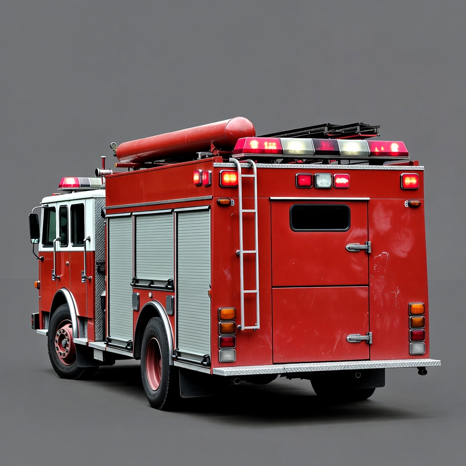 emergency vehicle, fire engine, firefighter truck, flashing lights, gray background, hoses, isolated background, ladders, rear view, red fire truck, red lights, rescue vehicle, siren lights, truck rear, fire truck