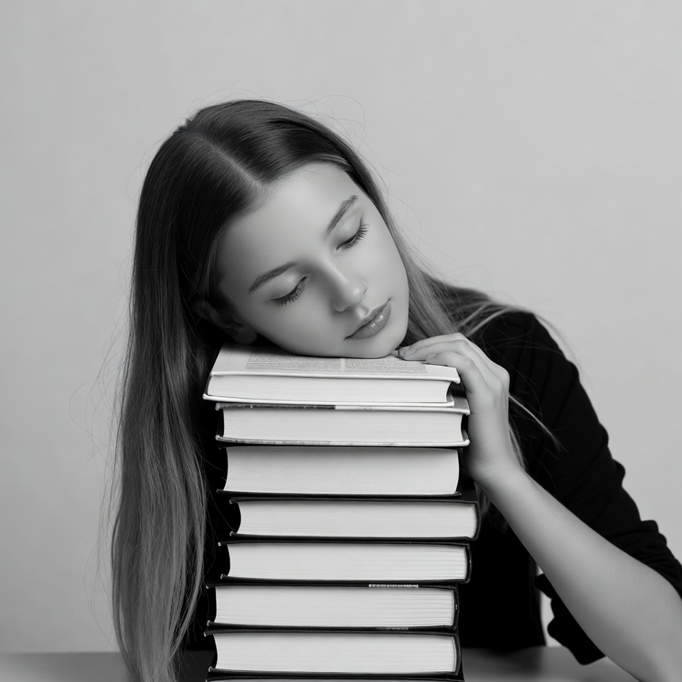 A young woman with long brown hair rests her head on a tall stack of books, appearing asleep with her eyes closed. She wears a dark long-sleeved top and gently holds the books with one hand. The image is in black and white against a plain white background.