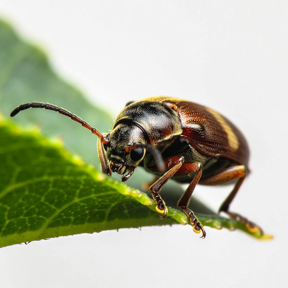 A small beetle with black, brown, and reddish-brown striped body crawls on a fresh green leaf. Its shiny exoskeleton features prominent antennae and legs gripping the leaf edge. The insect is positioned against a white background.