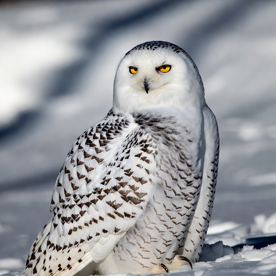 A snowy owl with white feathers speckled in black sits on the snow. It has bright yellow eyes and stares directly at the camera. The background features a snowy landscape with soft lighting.