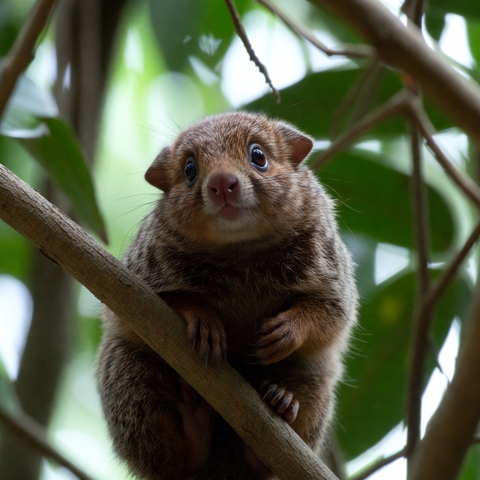 A small sugar glider with brown fur and large round eyes clings to a thin tree branch. It has pink nose and paws, surrounded by green leaves and branches in a natural setting. The animal gazes forward with an alert expression.
