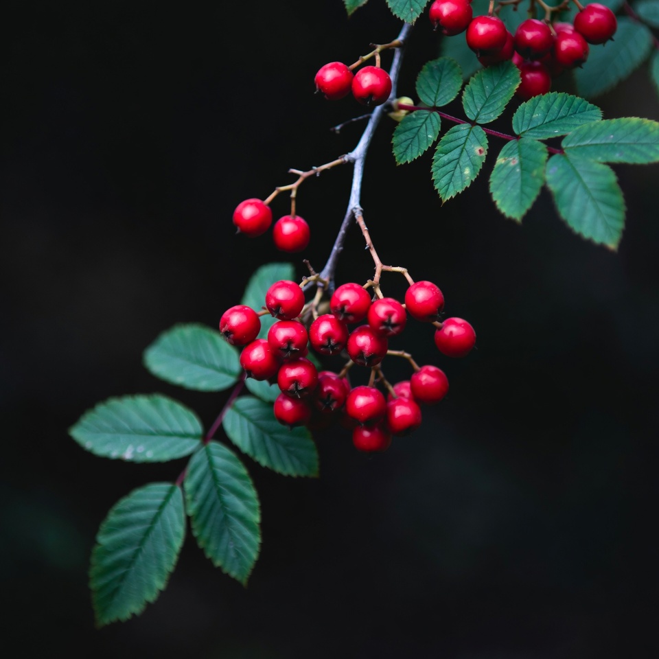 berries, branch, closeup, cluster, dark background, fruit, green leaves, isolated background, macro, mountain ash, nature, plant, rowan berries, serrated leaves, vibrant red, red berries