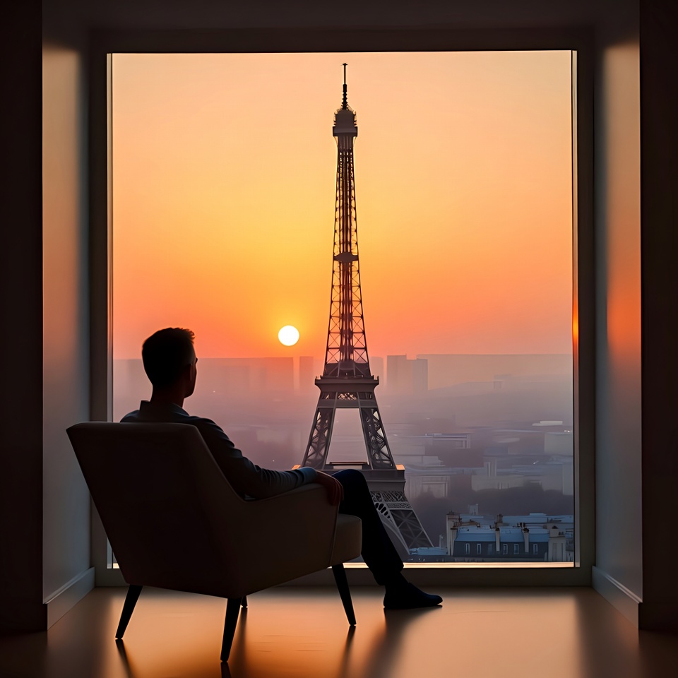 A silhouette of a man sits in a white armchair gazing out a large window at the Eiffel Tower during sunset. The sun sets behind the iconic tower, casting orange hues over the Paris skyline. He wears casual clothing with legs crossed and one shoe off.
