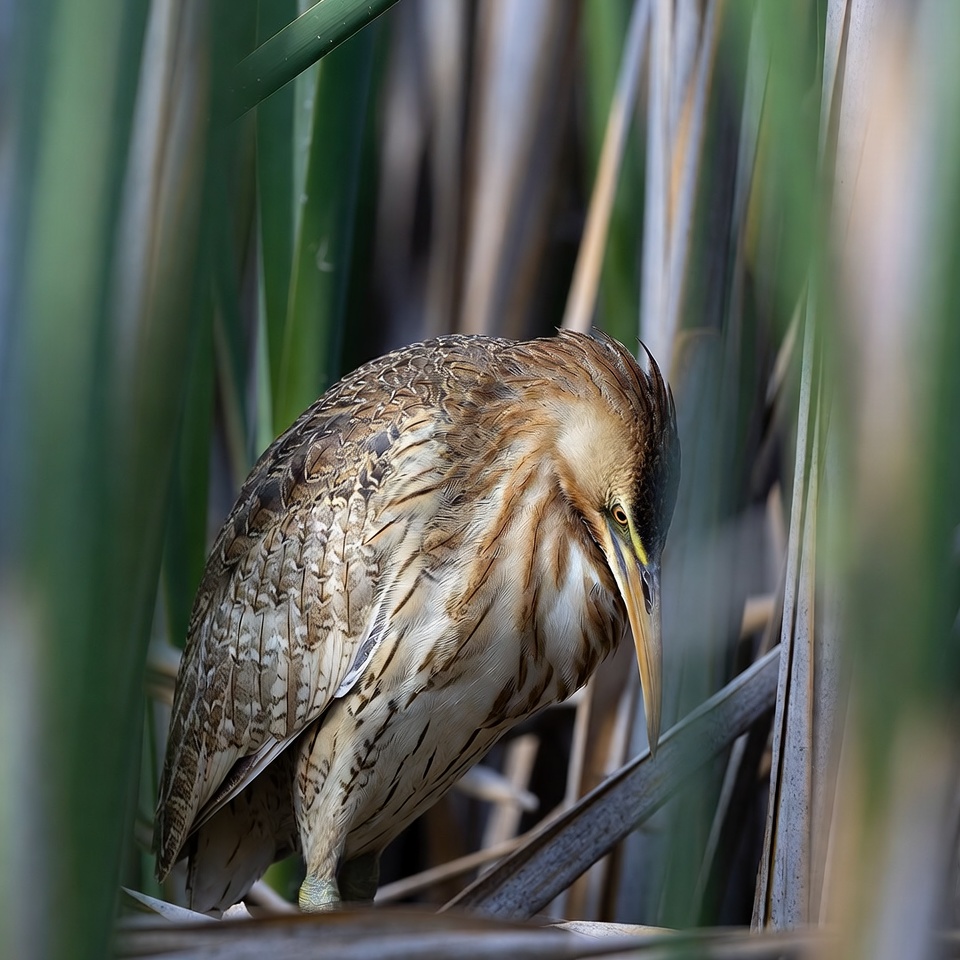 A bittern with brown streaked feathers crouches low among tall green reeds. Its long yellow beak is pointed downward, and its neck is partially hidden by the surrounding vegetation. The bird blends seamlessly with the natural wetland environment.