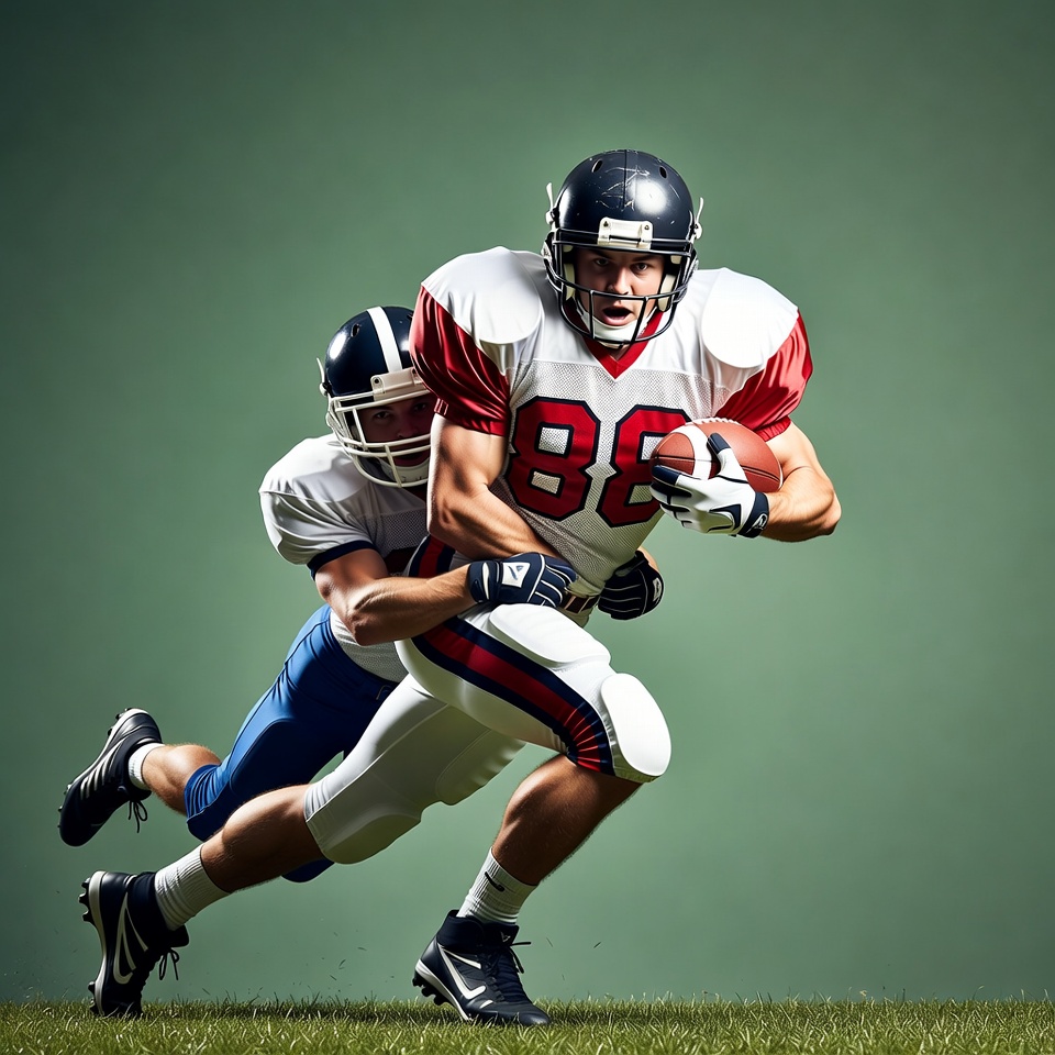 A muscular White football player in red and white jersey number 86 runs with the football while being tackled by a White defender in blue uniform. Both wear helmets and pads on a green field. The ball carrier holds the football firmly as the defender grabs his legs.