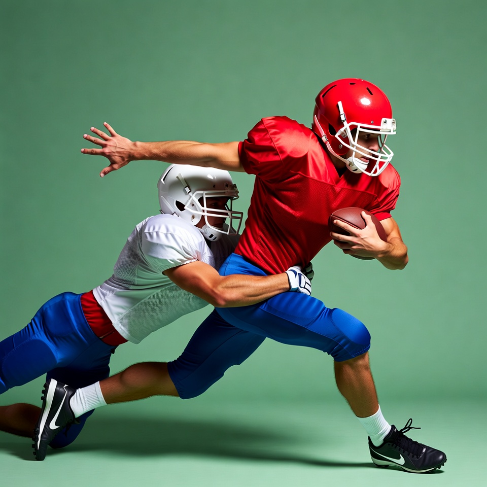 American football, White, action, athletic, competition, defender, dynamic pose, football ball, green background, gridiron, helmet, jersey, male athletes, men, muscular, player, pursuit, red jersey, running, sports, tackle, white jersey, football